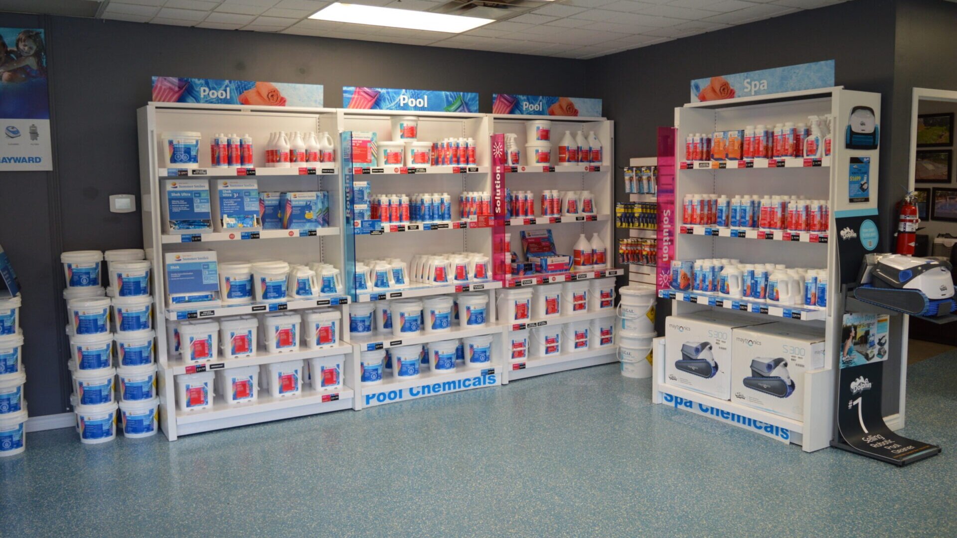 We stock chlorine, shock treatments, algaecides, pH balancers, clarifiers, and specialty chemicals for all pool types.